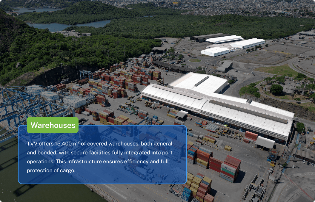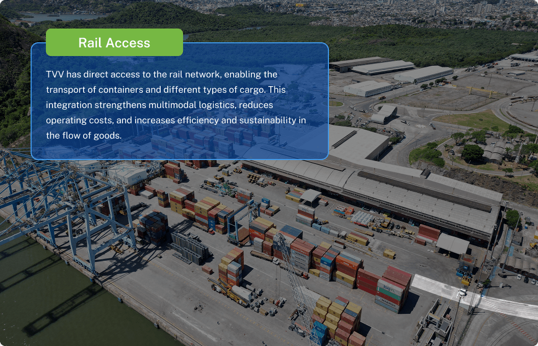 TVV provides solutions for sectors such as agribusiness, automotive, consumer goods, hazardous cargo (IMO), steel, mining, offshore, fertilizers, bulk commodities, stone, and more. It handles a wide variety of cargo — containerized, general, OOG, reefer, etc.